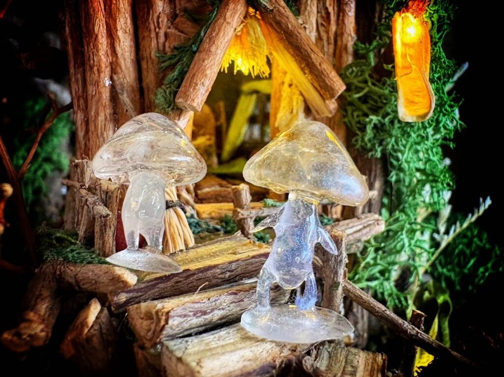 夜になると、きのこの笠にほんのり光を宿し、暗い森をそっと照らします。