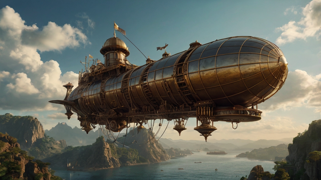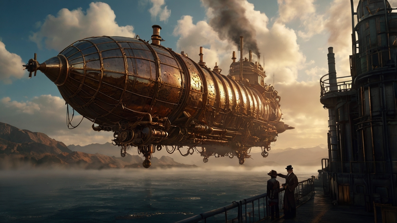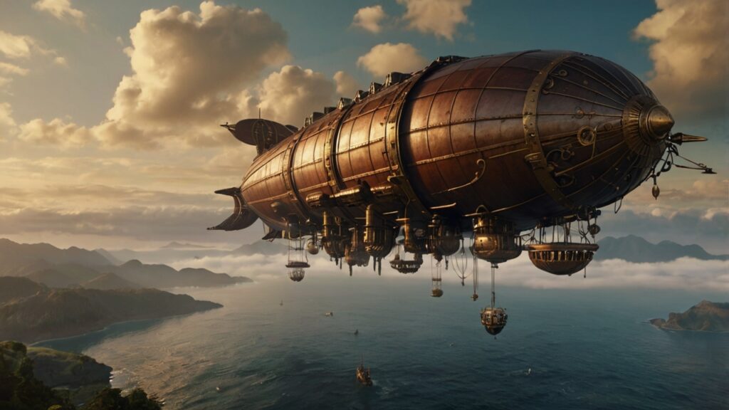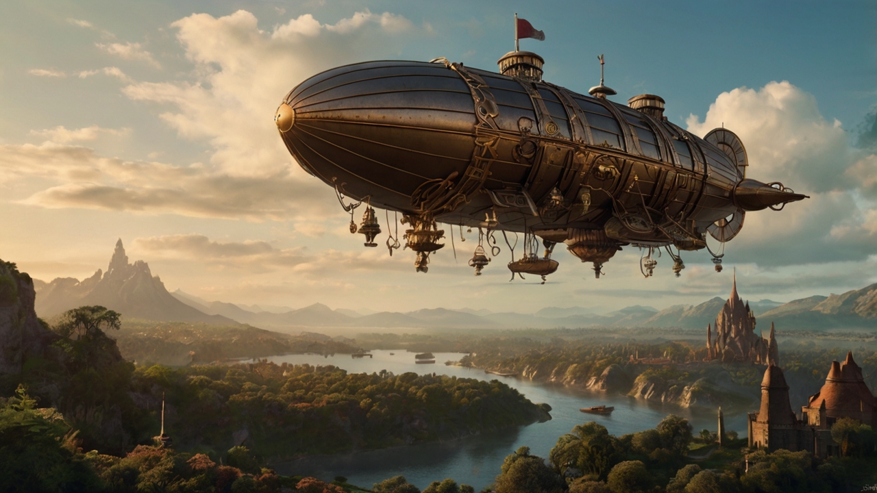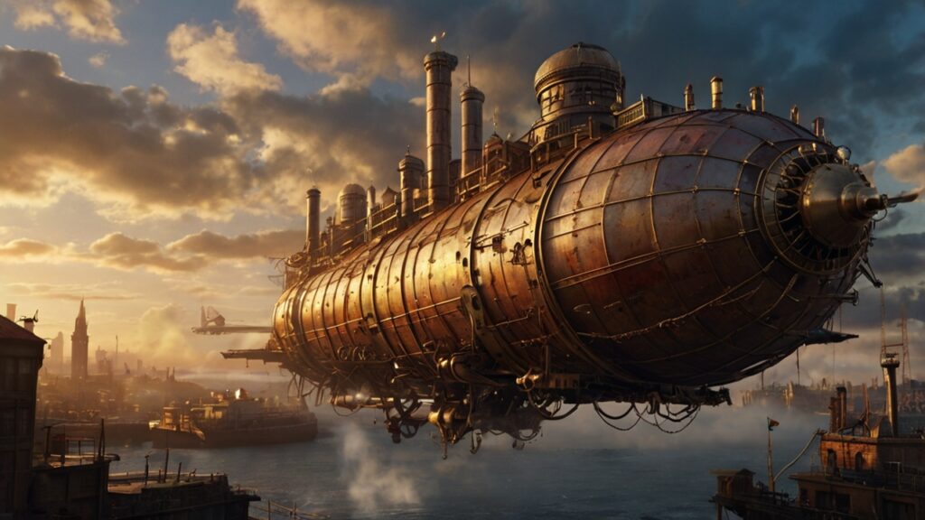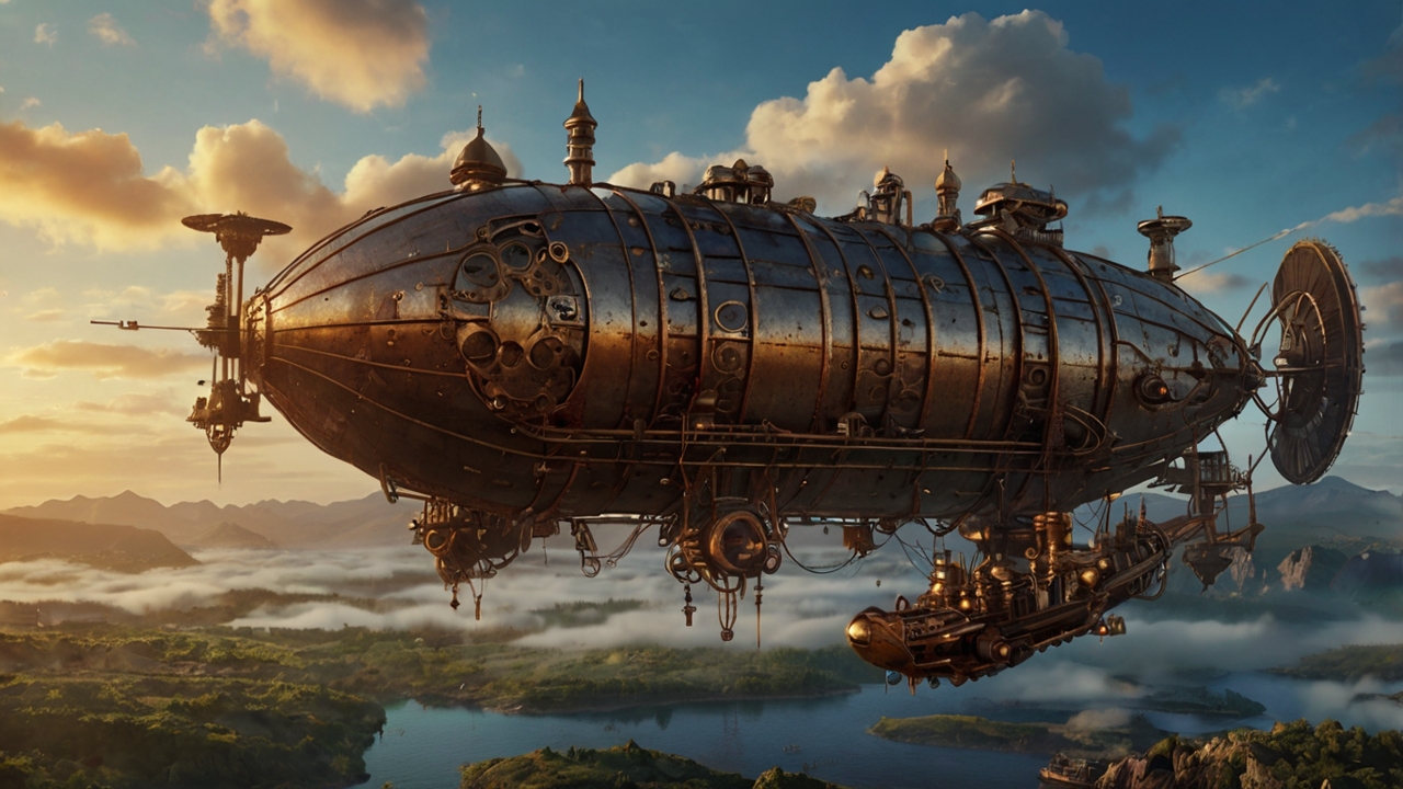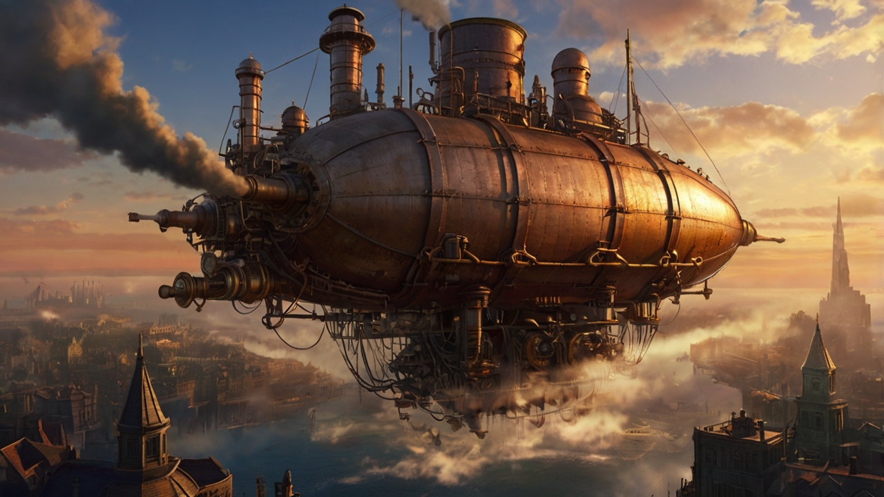 ファンタジーイラスト【スチームパンク飛行船と機械都市】フリー素材-背景-商用利用可