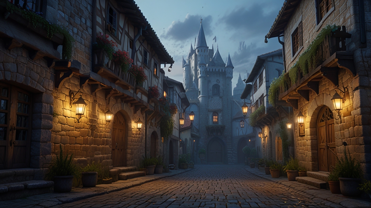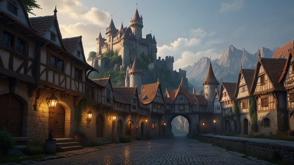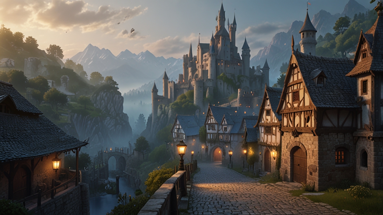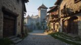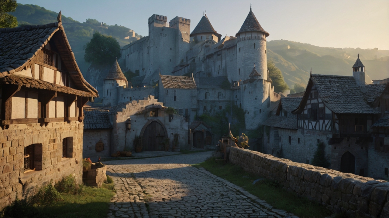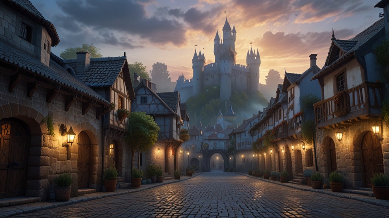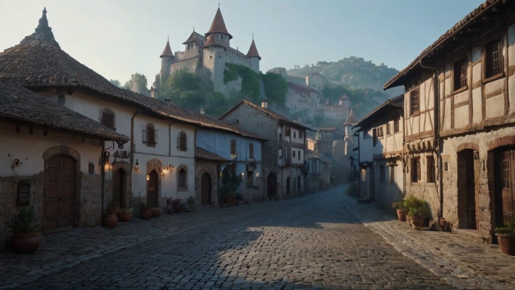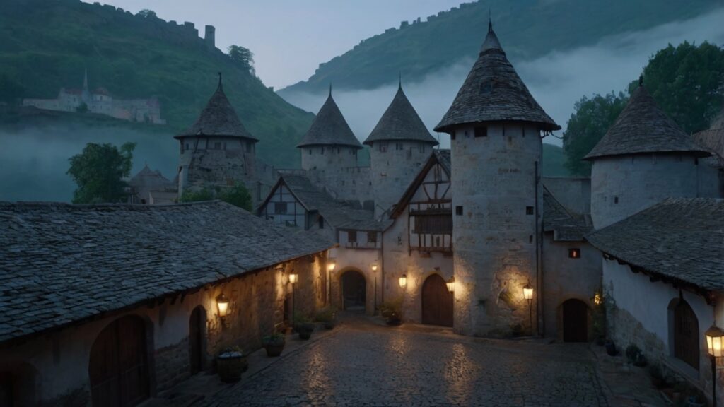 【冒険の旅立ち ― 朝もやに包まれた中世の城と街並み#2】フリー素材-背景-商用利用可